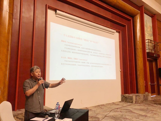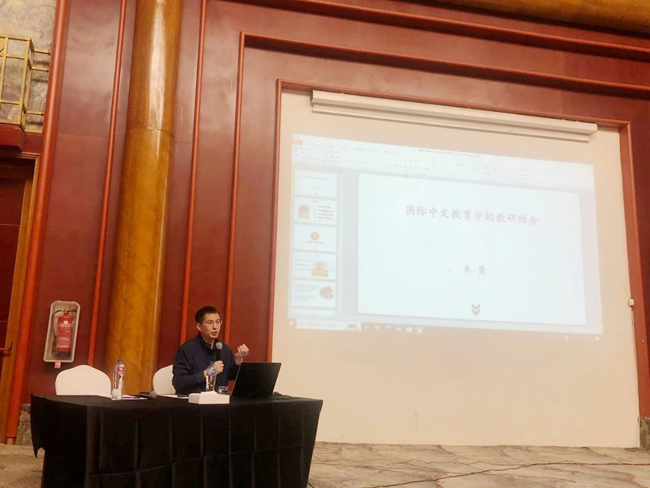 北京外国语大学朱勇教授以《国际中文教育用中国文化和国情参考框架》(以下简称《参考框架》)与教师文化素养为主题,从《参考框架》的结构以及编写理念、《参考框架》与文化教学、如何提升教师的文化素养等三个角度,通过逐一举例说明的方式对《参考框架》进行深入解读。朱教授还以“国际中文教育中的教研结合”为题,从语言教学法的系统性、理论与实践创新的系统性结合、产出导向法教学实践当中的问题对策等维度,结合教学研究型案例,指导教师们在今后的教学中遇到问题之后如何分析问题、解决问题,回馈教学。