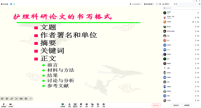讲座中,刘教授的讲解深入浅出,引人入胜,不时引来线上阵阵掌声与点赞。与会教师纷纷表示,此次讲座内容丰富,讲解透彻,他们受益匪浅,不仅掌握了实用的写作技巧和方法,更深刻认识到了护理科研工作的重要性与挑战性,对未来如何开展科研工作有了更加明确的方向和目标。