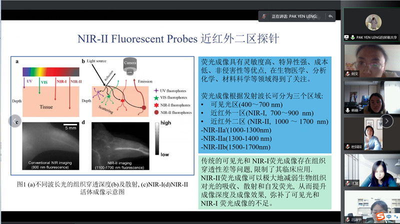 白燕玲老师从自己目前的研究内容出发介绍了近红外二区荧光探针的发展现状。与近红外一区(NIR-Ⅰ,700~900 nm)相比,近红外二区(NIR-Ⅱ,1000~1700 nm)成像具有更多的优势,能够促进深部疾病的精确诊断,NIR-Ⅱ荧光探针是NIR-Ⅱ荧光成像的基础,目前已开发了一系列基于有机和无机材料的NIR-Ⅱ荧光探针。何文老师从科研方向、文章阅读与下载、经费来源等方面分享自己的科研经验。之后教研室各教师进行讨论,王慧老师针对目前各教师居家上网课的实际情况,建议大家在“中国科学技术协会”网站进行中文文献的免费下载,其他老师也提出了自己在科研方面遇到的瓶颈和给大家的建议。