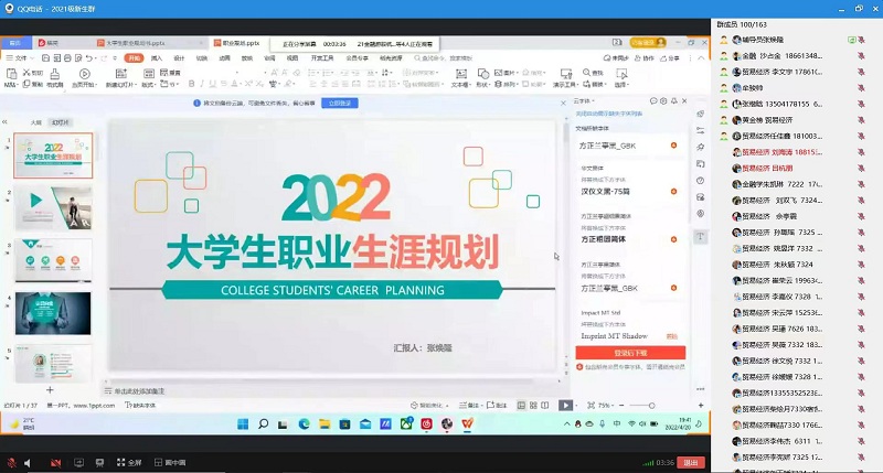 更新时间:2022-05-02 10:21 当前,大学生就业形势日益严峻。为做好受新冠肺炎疫情影响下的大学生就业工作,帮助学生明确就业方向,提高就业质量,我院于4月21日晚召开线上就业指导服务系列讲座——“大学生职业生涯规划”。本次讲座的主讲人为2021级辅导员老师张焕隆,2021级贸易经济、2021级金融学、2021级投资学三个专业共160名学生参与此次讲座。