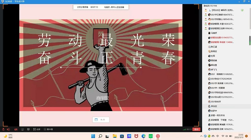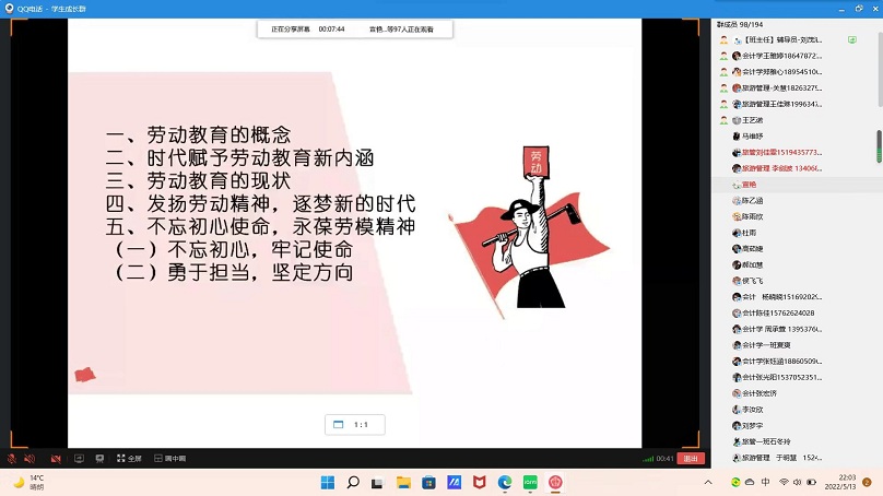 首先,商学院开展了以“劳动最光荣,奋斗正青春”为主题的一次劳动教育班会,让学生近距离聆听基层一线劳动者讲述他们爱岗敬业、甘于奉献、勇于创新的感人故事。鼓励学生发掘身边的劳动模范,培养学生精益求精、追求卓越的精神,让劳模精神、劳动精神、工匠精神融入学校人才培养和教育教学中,营造良好的劳动氛围。