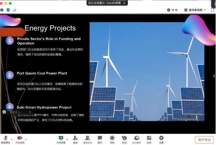 讲座中,SABIL博士主要就介绍公私合作、中巴经济走廊中公私合作的重要性、利用公私合作模式推进中巴经济走廊项目、中巴经济走廊公私合作框架、公私合作实施中的挑战与解决方案以及未来展望与结论六个方面对全体教师进行了介绍。