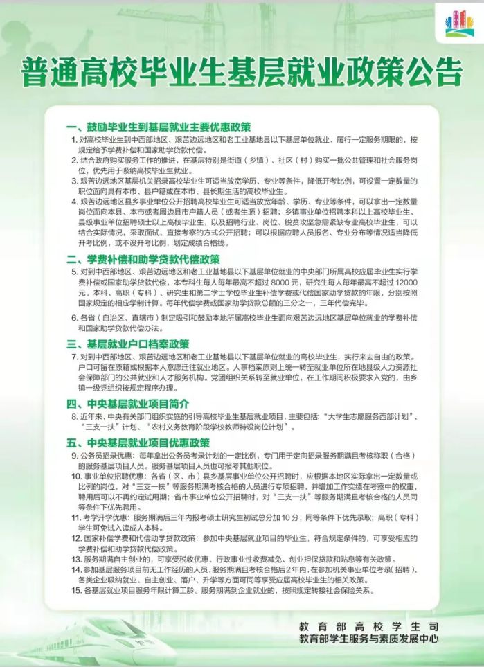 (一)编发政策公告。教育部印发《普通高校毕业生基层就业政策公告》《普通高校学生自主创业政策公告》《普通高校学生应征入伍政策公告>《普通高校毕业生就业服务公告》。各地教育行政部门和各高校要结合实际编制本地本校就业政策公告,采用翻印张贴海报、编发手册等方式做好国家和地方毕业生就业政策公告的宣传。