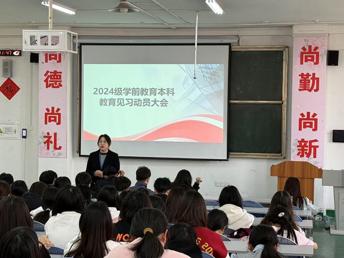 3月24日上午11:00,教育学院在教学楼A112成功举办2025年教育实习动员大会。副院长尚均林、李秋琳,2024级学前教育本科生及2023级学前教育专科生参加。