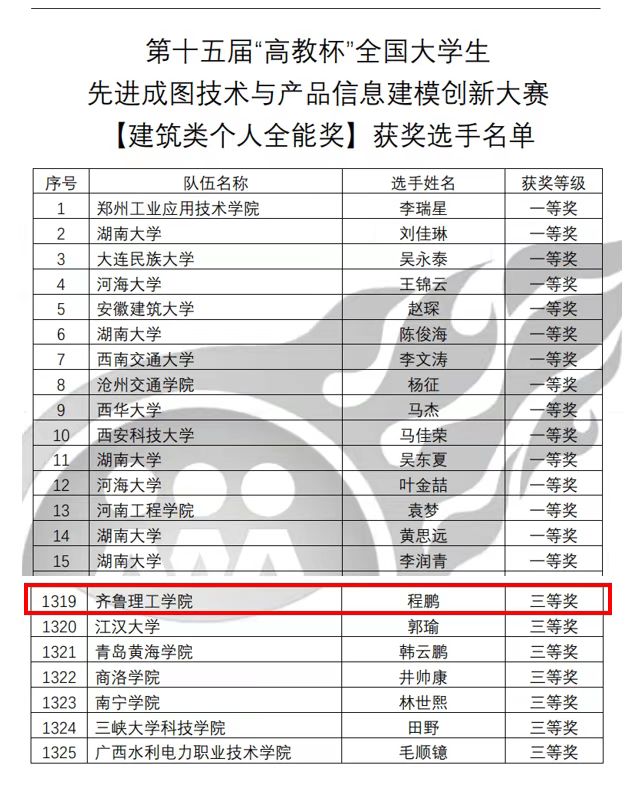 8月2日,第十五届“高教杯”全国大学生先进成图技术与产品信息建模创新大赛决赛圆满落幕。我院学子程鹏在比赛中获得建筑类个人全能三等奖的优异成绩。