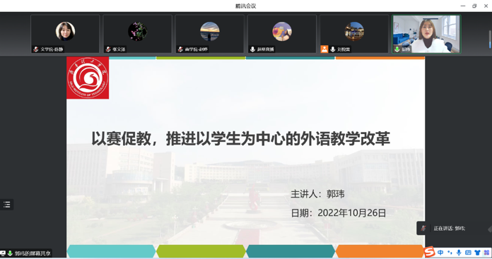 郭玮老师分享了“以赛促教,推进以学生为中心的外语教学改革”为主题直播课,郭老师聚焦青年教师比赛和教学创新大赛,结合自己丰富的教学比赛经验,围绕日常教学中如何推进以学生为中心的教学改革发表了自己的看法,并结合课堂教学设计实例进行了展示,对以赛促教、以赛促改推动课堂的教学改革创新起到了示范引领作用。