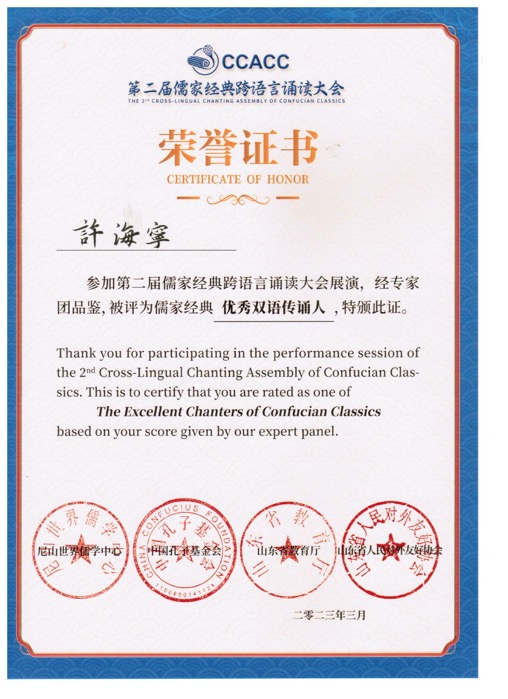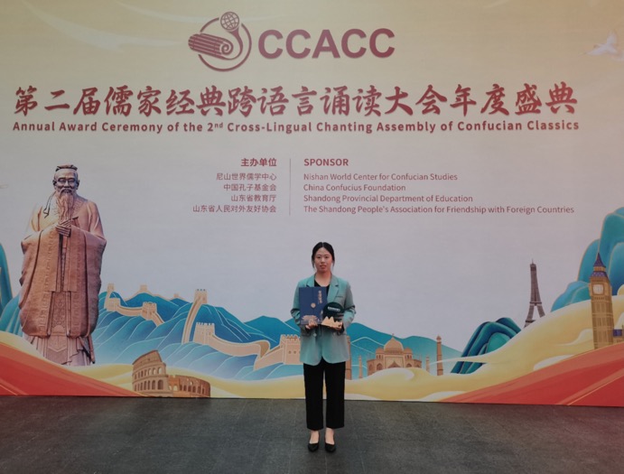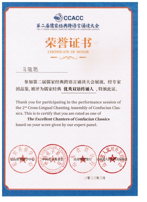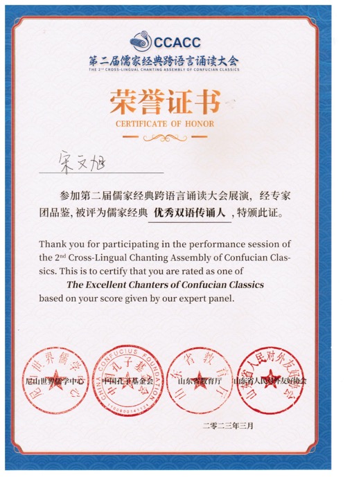 第二届儒家经典跨语言诵读大会自2022年8月份启动以来,由尼山世界儒学中心、中国孔子基金会、山东省教育厅、山东省人民对外友好协会共同主办,中国孔子网融媒体、山东省翻译协会、MILAN米兰体育·(中国)官方网站承办,获得教育部中外语言交流合作中心、中国翻译协会的大力支持。大会共征集作品4200余件,涌现出大批优秀作品,搭建了多语种、跨文化、高水平的文明交流互鉴平台。文学院高度重视此次比赛,积极筹备,科学指导,将优秀传统文化有效融入双语传诵作品中,最终喜获佳绩。