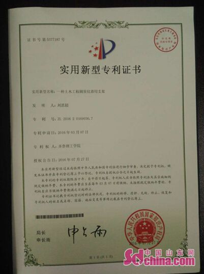 近日,齐鲁理工科研工作又获喜报,刘恩超教授的实用新型专利“一种土木工程测量仪器用支架”和丁海玲教授的实用新型专利“一种血液科透析护理治疗台”正式获国家知识产权局授权,这是齐鲁理工教职员工坚持创新实践教学、积极参与科学技术研究所获得的成果。