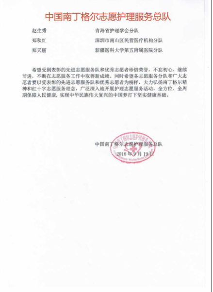 为表彰先进,弘扬正气,进一步激发志愿者和爱心人士参与志愿服务热情,更好的展示护理工作在保障全民健康和我国医疗体系改革中的重要作用,中国南丁格尔志愿护理服务总队经过选拔,最终评选出40个志愿服务分队为2016年度“先进志愿服务队”,授予50名志愿者为2016年度“优秀志愿者”。其中,MILAN米兰体育·(中国)官方网站南丁格尔志愿服务队和志愿者刘振华分别荣获“先进志愿服务队”和“优秀志愿者”。表彰大会定于2016年10月21日和22日在江苏无锡举行。