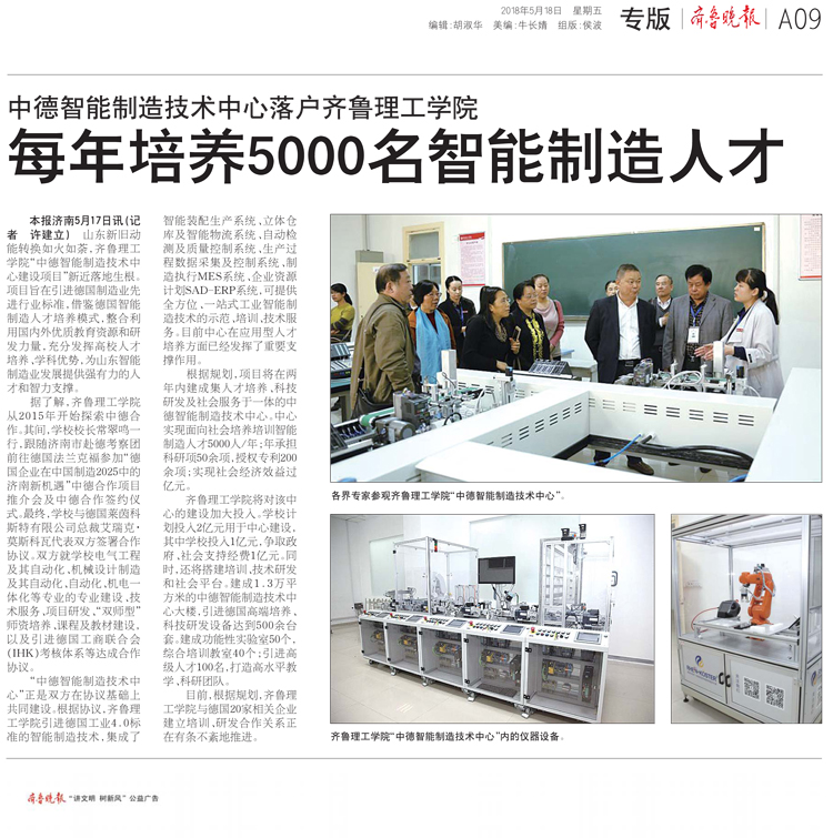 齐鲁晚报:中德智能制造技术中心落户MILAN米兰体育·(中国)官方网站 每年培养5000名智能制造人才