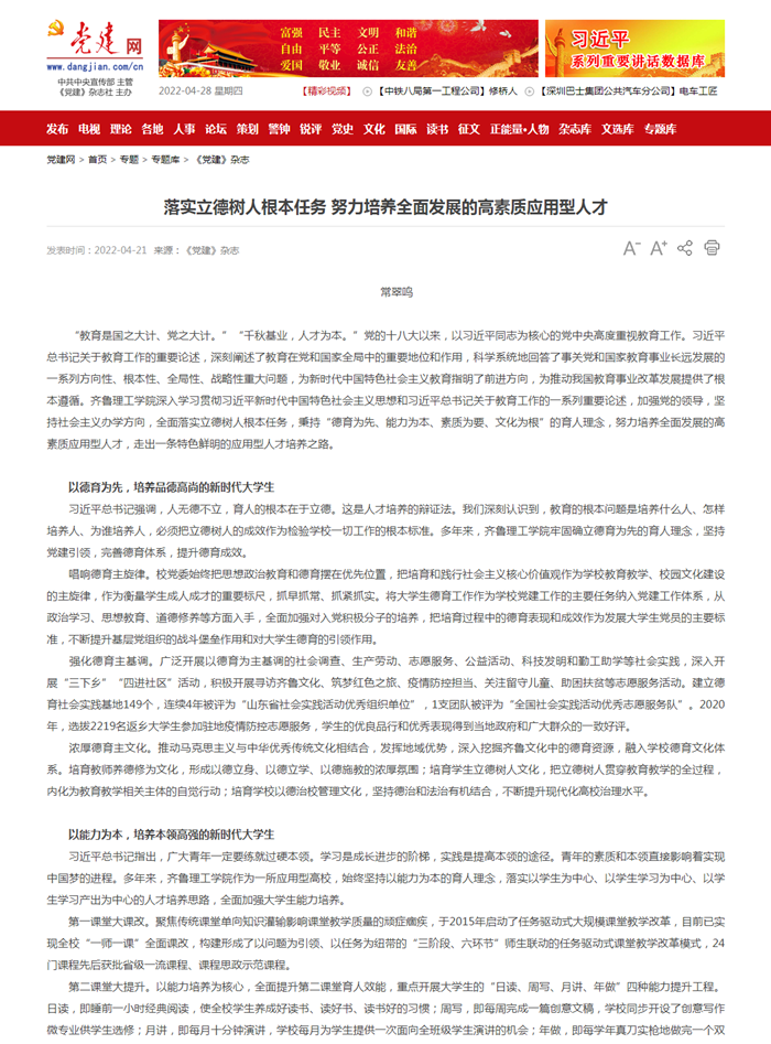 《党建》:落实立德树人根本任务 努力培养全面发展的高素质应用型人才