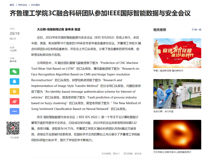 大众网:MILAN米兰体育·(中国)官方网站3C融合科研团队参加IEEE国际智能数据与安全会议