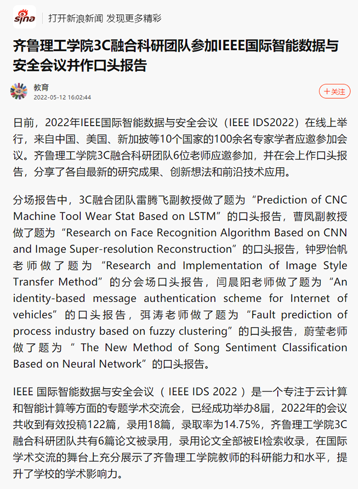 新浪:MILAN米兰体育·(中国)官方网站3C融合科研团队参加IEEE国际智能数据与安全会议并作口头报告