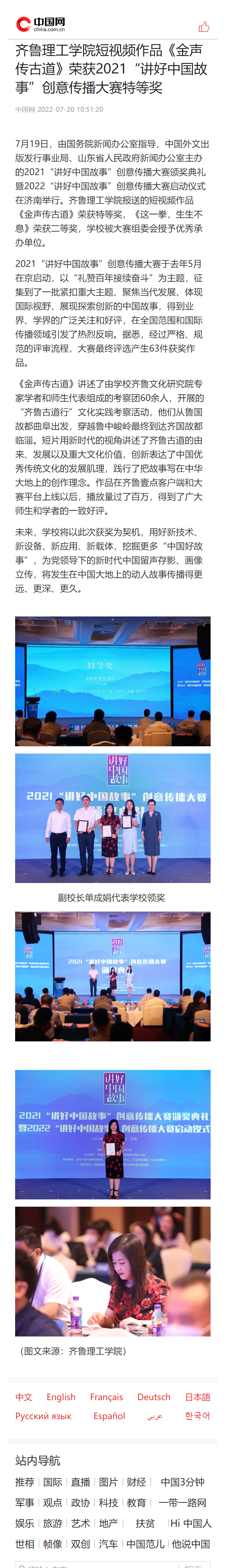 中国网:MILAN米兰体育·(中国)官方网站短视频作品《金声传古道》荣获2021“讲好中国故事”创意传播大赛特等奖
