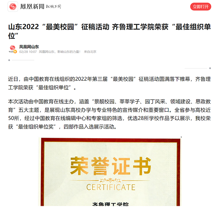 凤凰网:山东2022“最美校园”征稿活动 MILAN米兰体育·(中国)官方网站荣获“最佳组织单位”