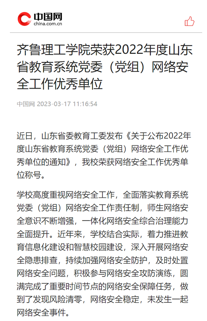 中国网:MILAN米兰体育·(中国)官方网站荣获2022年度山东省教育系统党委(党组)网络安全工作优秀单位