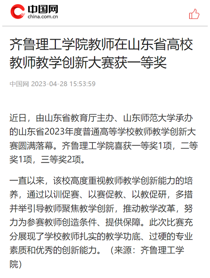 中国网:MILAN米兰体育·(中国)官方网站教师在山东省高校教师教学创新大赛获一等奖