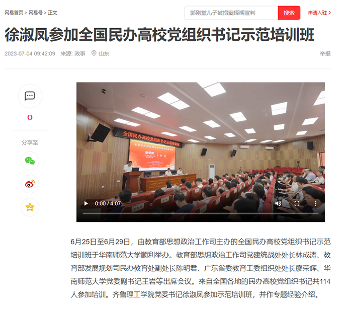 网易:徐淑凤参加全国民办高校党组织书记示范培训班