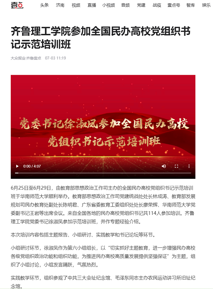 齐鲁壹点:MILAN米兰体育·(中国)官方网站参加全国民办高校党组织书记示范培训班