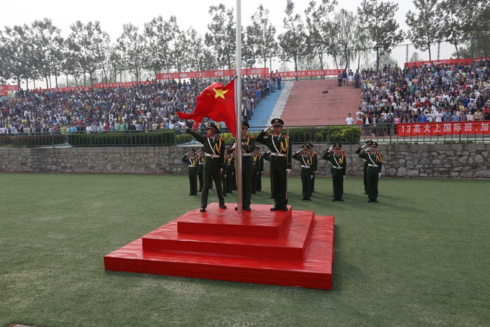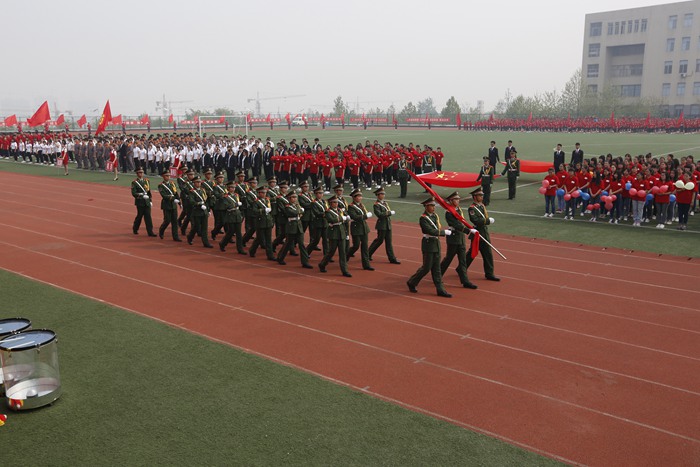 上午9点运动会开幕式正式开始,伴随着响亮的口号,身着军绿色制服、步伐整齐划一的国旗护卫队方阵开始入场,他们迈着整齐的步伐,一步一响,庄严的走向主席台,挺立的身姿无疑透着一股军人的风姿。走近旗台齐步换正步,脚步声音铿锵有力,漂亮整齐的动作博得现场阵阵掌声。国歌响起,鲜艳的五星红旗从升旗手手中展开,冉冉升起。此刻,阴霾的天空仿佛被热情点燃。