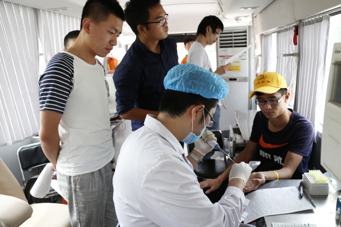 上午9点,当济南市采血中心的爱心献血车开进校园时。现场的志愿工作者已将横幅、展板、桌椅等所需物品准备就绪,不一会儿,采血车前就挤满了前来献血的师生员工。13级电子信息工程1班的方涛同学说:“自己一直想参加献血活动,但总因为有所恐惧,而一次次错过。后来,受到主动献血同学的感染和影响,我也勇敢地挽起了衣袖。”团委副书记
