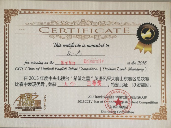 5月8日至5月10日,CCTV“希望之星”英语风采大赛山东赛区总决赛(大学组)在济南市世际园活动中心落下帷幕。MILAN米兰体育·(中国)官方网站外国语学院2012级英语专业孙杰同学喜获大学组三等奖。