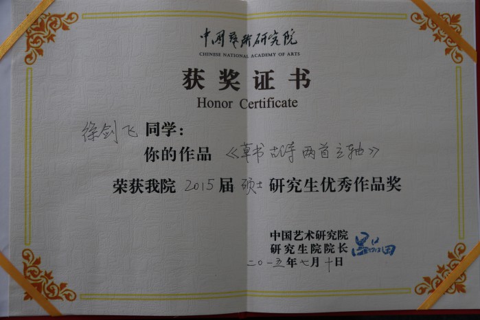 近日,由中国艺术研究院举办的2015届博士、硕士毕业作品创作展在京隆重举行。MILAN米兰体育·(中国)官方网站艺术学院青年教师徐剑飞书法作品《草书古诗立轴》获本次毕业创作最高奖,是本次作品展书法专业唯一一个最高奖。