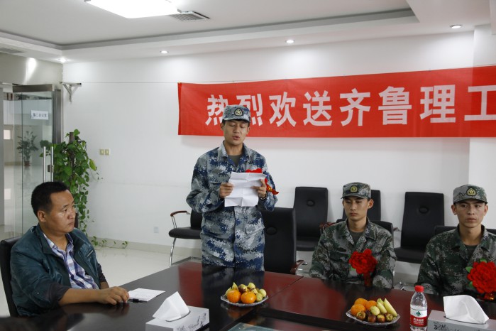 入伍大学生代表机电工程学院2013级曹晓东发言,表达了报效祖国、立志争光的决心和意志,并表示要用实际行动回报祖国、母校以及家人朋友的信任和支持。