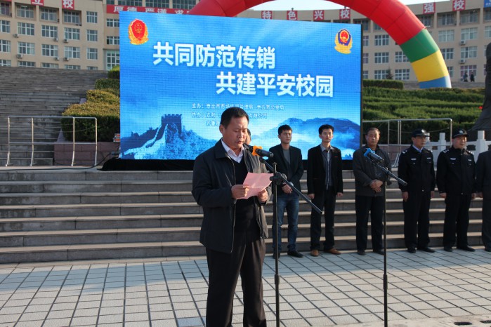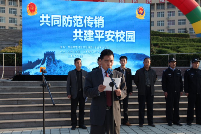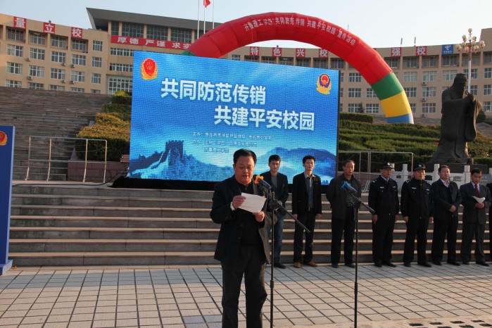 章丘市市场监督管理局副局长夏邑军首先代表活动主办单位进行讲话。夏局长就当前国家打击传销的相关政策、法规,驻章高校打传工作的形势和进展进行深入分析和解读,并在讲话中高度赞扬了我校在打击防范传销,维护地区稳定,共建和谐章丘方面做出的贡献。