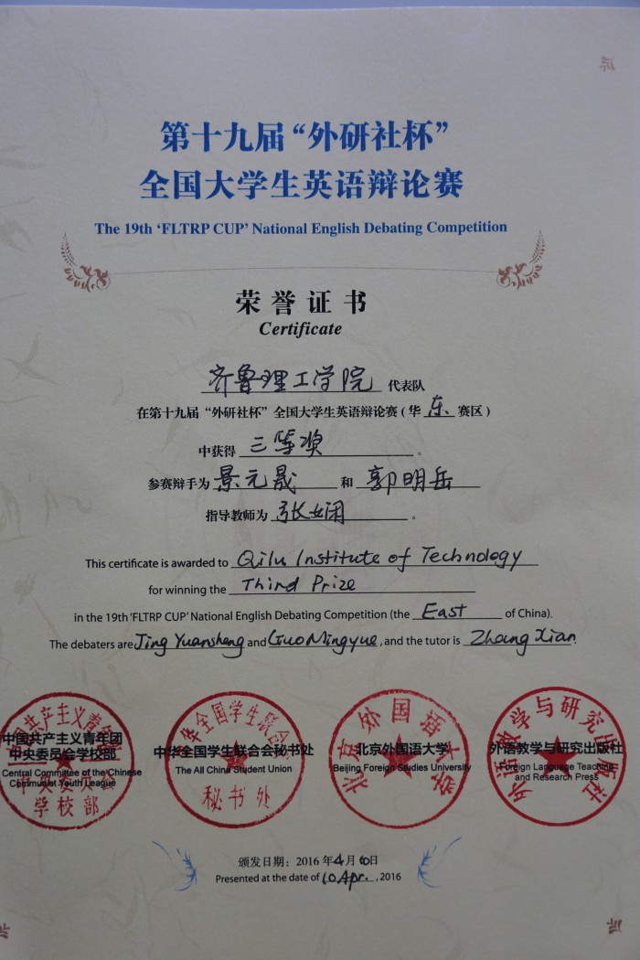 4月10日,第十九届“外研社”杯全国大学生英语辩论赛华东赛区地区赛在南京理工大学落下帷幕,来自复旦大学、南京大学、浙江大学在内的105支队伍参加了本次比赛。由我校外国语学院2013级英语专业景元晟、2015级英语专业郭明岳两名同学组成的MILAN米兰体育·(中国)官方网站代表队与各高校代表队同台竞技。经过3天5轮循环赛的激烈角逐,我校代表队荣获华东地区三等奖。指导老师张娴顺利通过评委考试,担任循环赛评委,并荣获优秀指导教师奖。