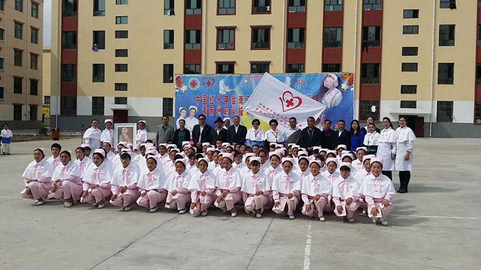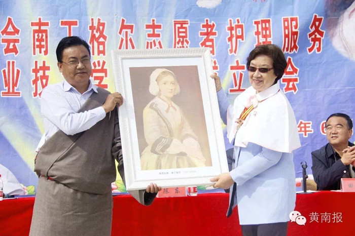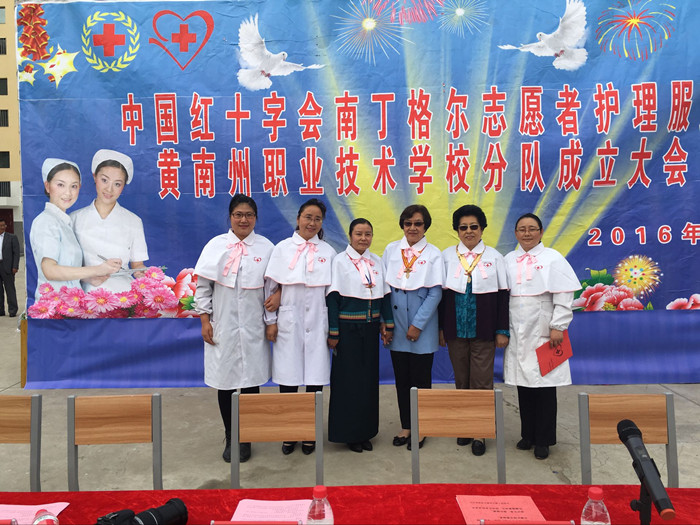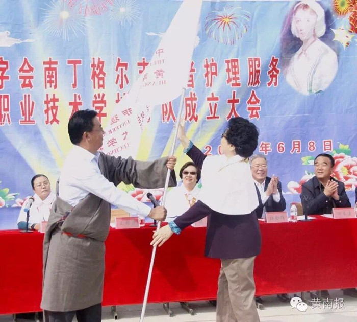2016年6月8日,在第四十届南丁格尔奖获得者、我校护理学院荣誉院长刘振华的帮助下,中国红十字会南丁格尔志愿护理服务队黄南地区成立大会在黄南州职业技术学校隆重举行。中国红十字会南丁格尔志愿护理服务总队理事长王雅屏、副理事长陈东,第41届南丁格尔奖章获得者泽仁娜姆,黄南州红十字会、黄南州人大、黄南州教育局和黄南州卫生系统的领导出席大会并致辞。黄南州职业技术学校100名新入队学生志愿者和全校师生千余人参加大会。大会由黄南州职业技术学校多杰冷智校长主持,