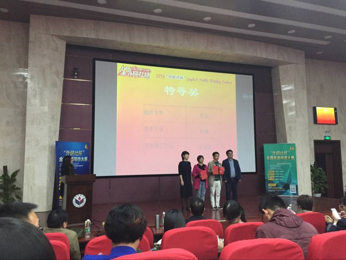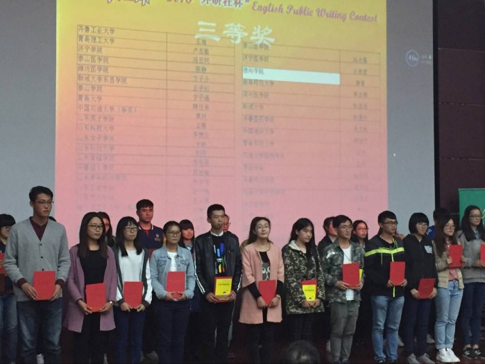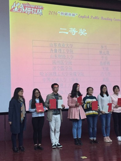 我校外国语学院2013级英语专业景元晟同学获本次英语写作大赛特等奖,获英语阅读大赛二等奖;2014级英语专业郭晨霞同学获英语写作大赛三等奖;2015级贸易经济专业田悦琳、关雅文同学分别获得英语阅读大赛、英语演讲大赛优胜奖;指导教师王丹获指导教师特等奖;外国语学院2013级英语专业景元晟同学将代表山东赛区参加"外研社杯"英语写作大赛全国总决赛。