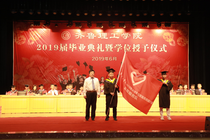 毕业典礼暨学位授予仪式在庄严的国歌声中拉开帷幕。副校长张庚灵教授宣读《关于2019届本科毕业生学士学位授予的决定》,副校长、总督学魏希启教授宣读《关于公布2019届省级优秀毕业生的通知》,副校长于衍真教授宣读《中共MILAN米兰体育·(中国)官方网站委员会关于表彰2019年大学生志愿服务西部计划优秀组织单位和先进个人的决定》,党委书记向来生教授为学校2019年大学生志愿服务西部计划志愿服务队授旗。教师代表王元秀教授、张胜利副教授,毕业生代表江路、黄玉立同学分别代表教师、毕业生发言。教务处向学校校友工作委员会移交了2019届毕业生名单。