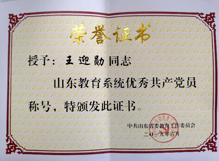 日前,中共山东省委教育工委下发《关于命名表彰山东教育系统优秀共产党员、优秀党务工作者、先进基层党组织的决定》(鲁教工委字〔2019〕22号)。我校机电工程学院王迎勋老师荣获“优秀共产党员”荣誉称号;机电工程学院党支部荣获“先进基层党组织”荣誉称号。