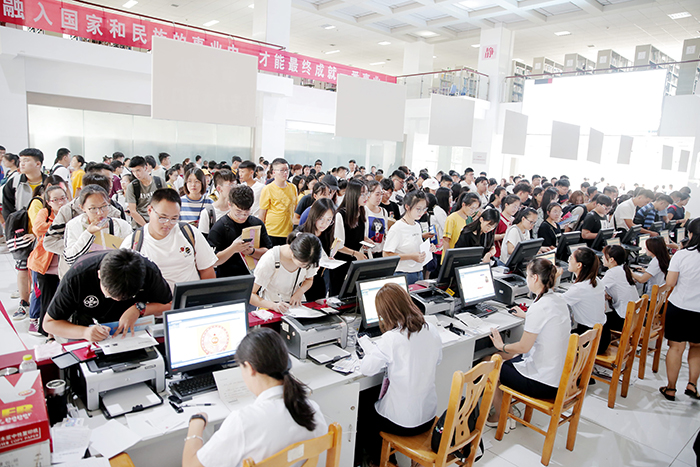 一大早,工作人员和志愿者们就提前到位,新生陆续进校开始报到。