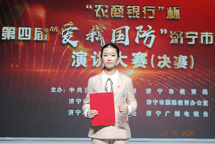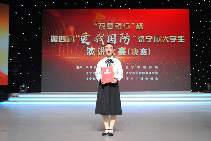 作为一项全国性国防教育活动,本次大赛自8月份开赛以来,7所驻济高校300多名大学生参加了比赛。经过初赛、预赛的层层选拔,11名优秀选手进入决赛现场。最终,我校付尚书、王洲同学用真情实感打动了现场每一位观众,大放异彩、拔得头筹,将代表济宁赛区参加山东省“爱我国防”演讲比赛。