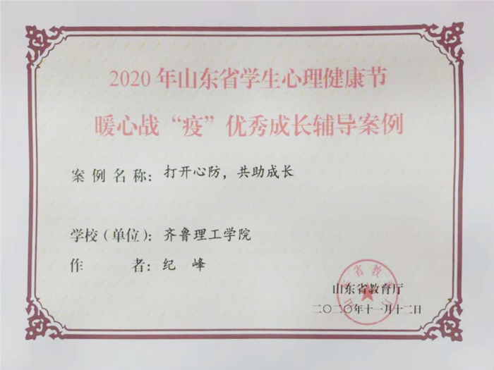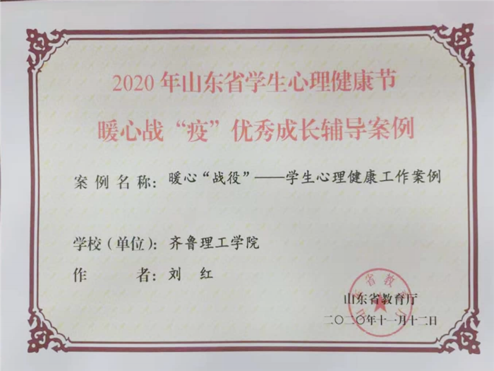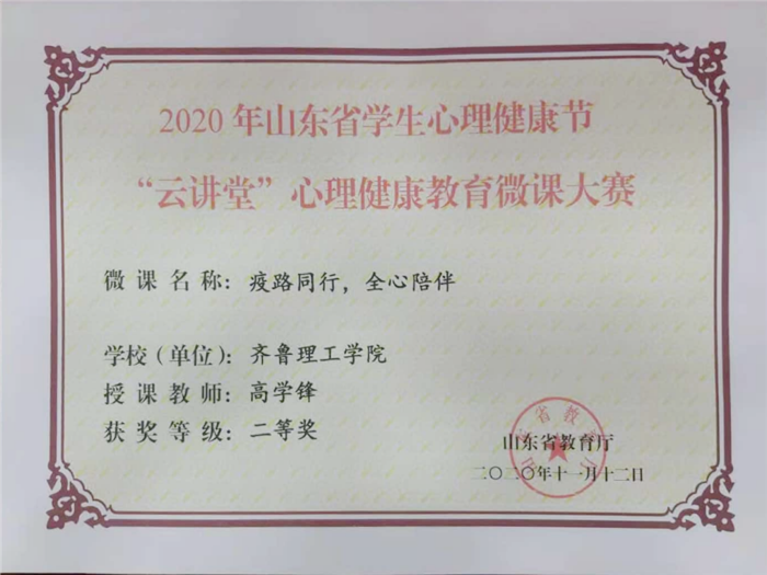 近日,山东省教育厅对2020年山东省学生心理健康节活动进行表彰,我校荣获多个奖项。我校高学锋老师的《疫路同行,全心陪伴》微课荣获“云讲堂”心理健康教育微课大赛二等奖;辅导员刘红的《暖心“战役”—学生心理健康工作案例》,纪峰的《打开心房,共助成长辅导案例》荣获暖心战“疫”优秀成长辅导案例。