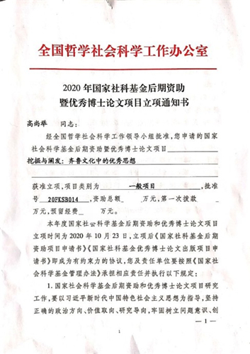 近日,2020年国家社科基金后期资助项目评审结果揭晓,我校文学院高尚举教授申报的《挖掘与阐发:齐鲁文化中的优秀思想》获准2020年国家社科基金后期资助暨优秀博士论文项目立项,项目批准号20FKSB014。