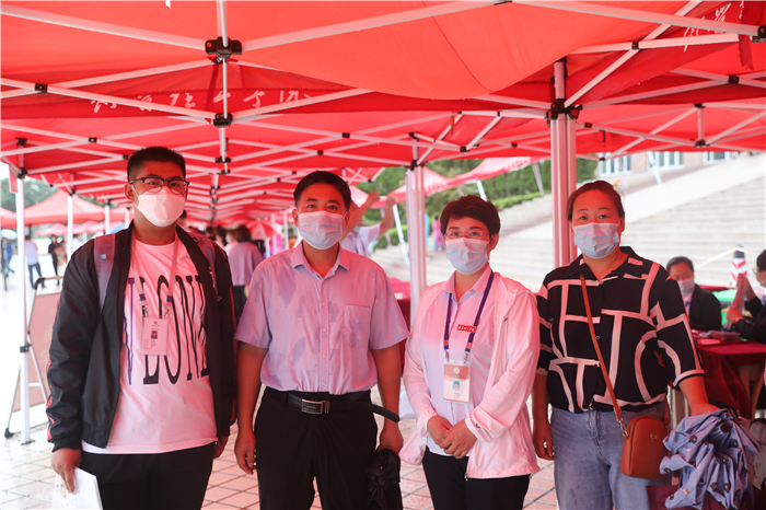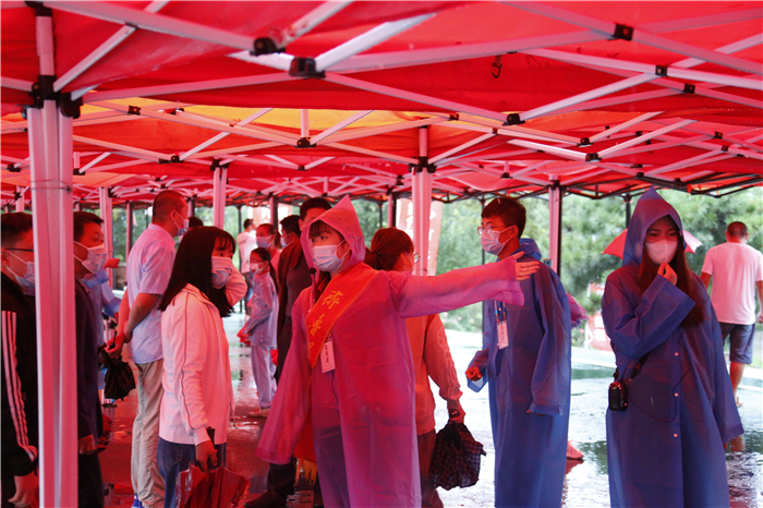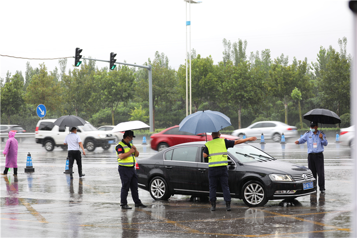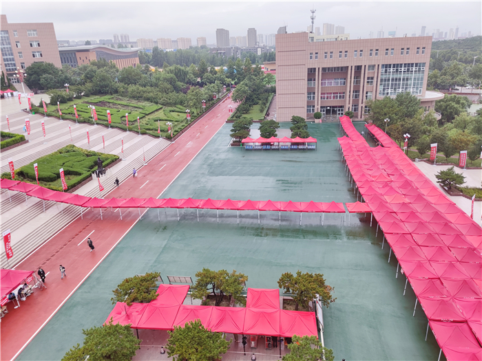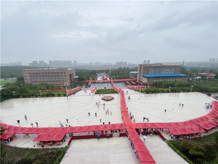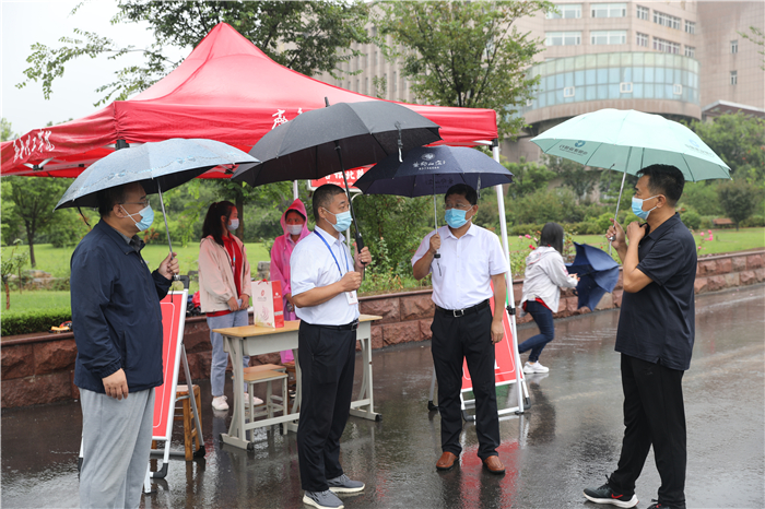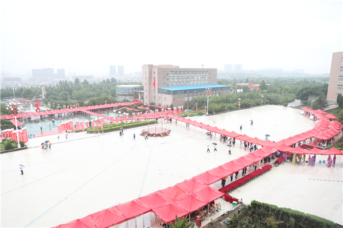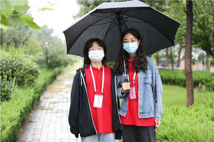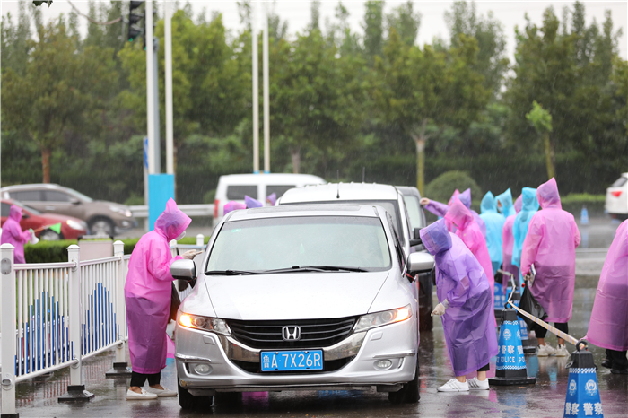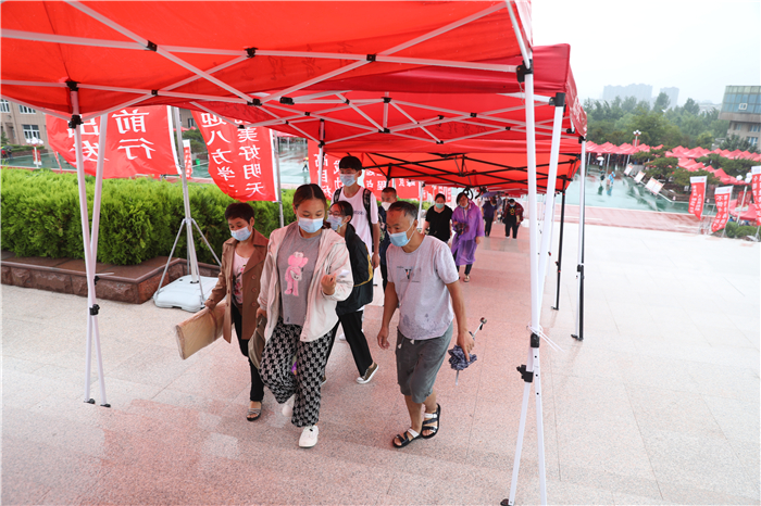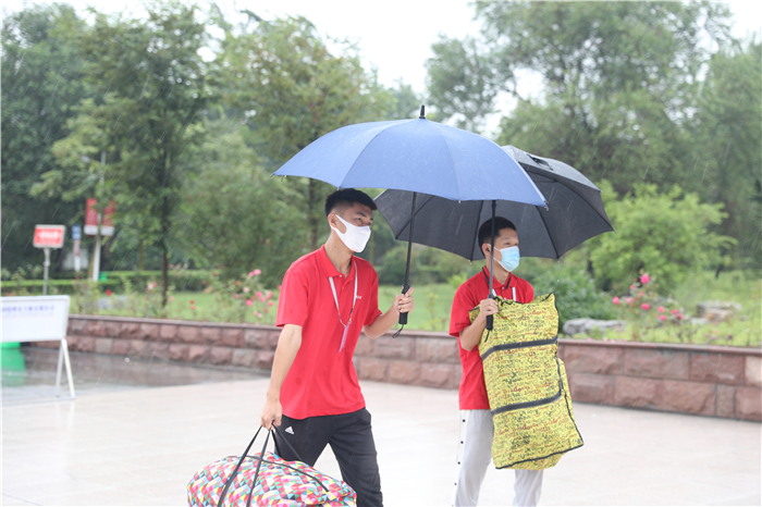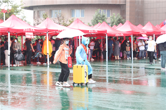 章丘区高教办负责人冒着大雨来到学校指导工作,看望慰问新生和工作人员,驻地的公安交警也冒雨协助维持交通秩序。全校2000多名师生志愿者坚守雨中,在车站机场接站点,在校内各个迎新站点,在宿舍区,疏导交通、转运行李、防疫检查、解答问题,热情、体贴地服务于每一位新生。