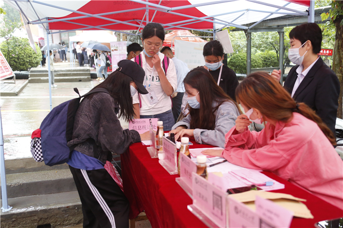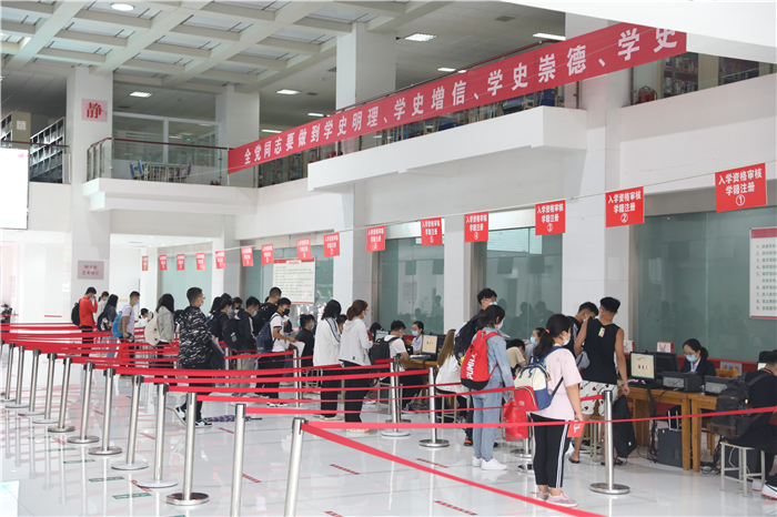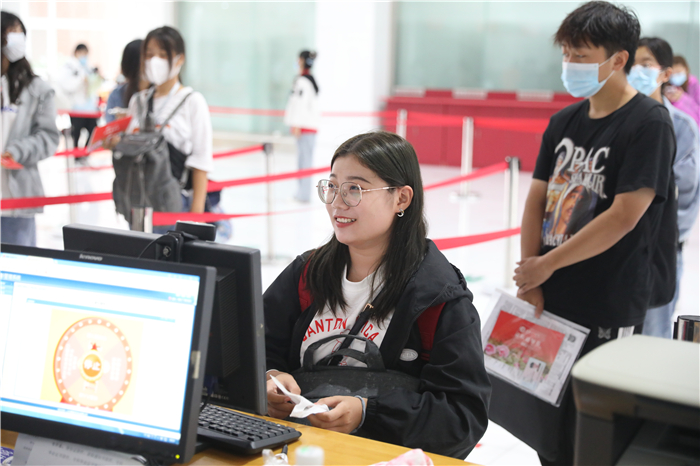 下个不停的秋雨给迎新工作带来很多困难,但所有工作人员坚守岗位、热情依旧。在学校大门口,工作人员身着雨衣、穿着雨靴指挥交通、查验健康码;在学生排队等候区,志愿者手持扩音器,不停地引导新生有序分组排队,嗓子都喊哑了;在入学注册审核现场,工作人员细心询问新生的个人信息,办理入学手续;在二级学院报到点,各学院院长和老师们在冷冷的雨中耐心地向家长和学生解疑答惑。等到下午,雨突然大起来,迎新指挥部再次启动紧急预案,把二级学院报到点由室外转移到室内。