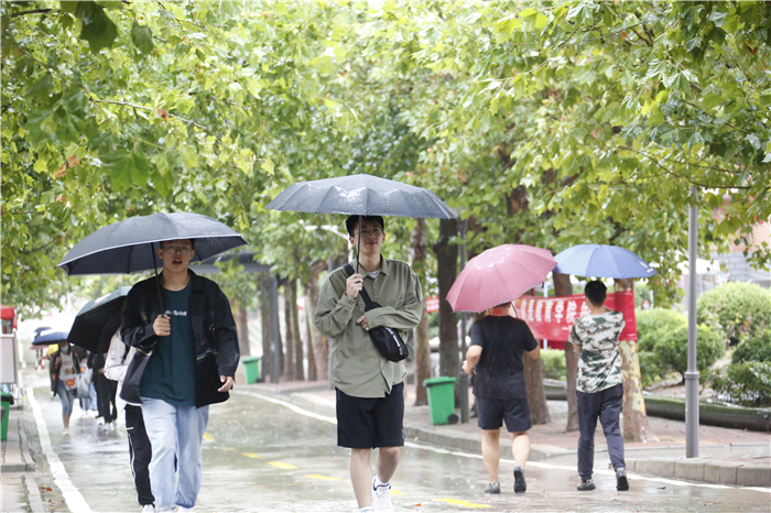 8月30日下午,绵绵秋雨仍在下,学校迎新指挥部立即启动预案,调整迎新工作方案,调集300多顶帐篷,在家长休息区、新生报到点和校园必经路上,搭起了壮观的遮雨长廊。为防止夜晚大风,当天晚上所有帐篷原地收起。31日早上5点,两个校区2000多名老师、志愿者早早地将避雨通道重新搭建好,保障新生可以一直在帐篷里办理入学手续,家长也能安全避雨休息。秋雨带来了寒气,为了大家的健康,学校还特地准备了红糖姜水,放置在学校各处,温热甜蜜的味道,让迎新工作更显温情。