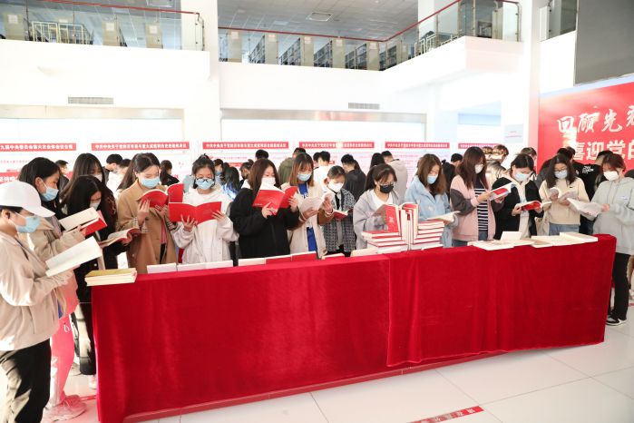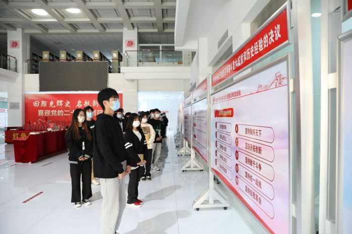 为深入推进党史学习,庆祝党的二十大胜利召开,10月19日下午,学校党委组织各学院学生党员到图书馆一楼大厅参观学习百年党史展和红色经典图书展。