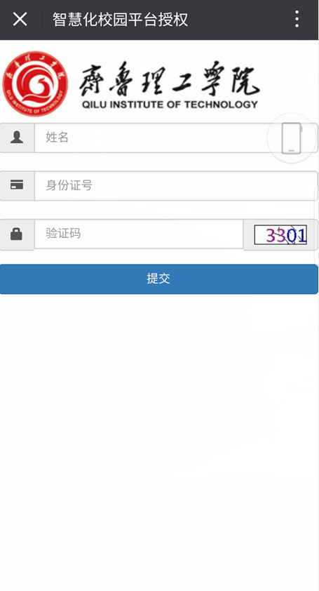 3、点击“新生服务平台”后,会跳转到登陆绑定页面,请按照提示输入姓名、身份证号码和验证码,注意姓名、身份证号码两侧及中间不要有空格,然后点击提交按钮。