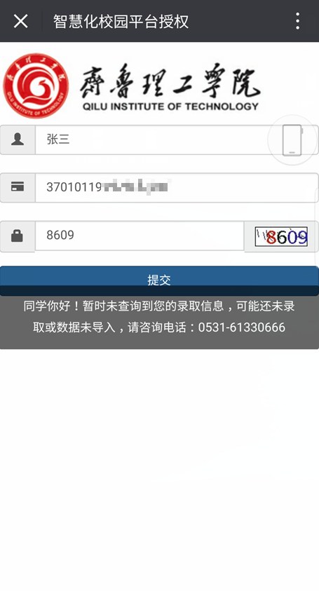 5、如果暂时还没有查询到您的录取信息,由于录取进程的差异,可能录取数据还没有更新,请拨打咨询电话0531-61330555进行咨询,或者稍后查询。
